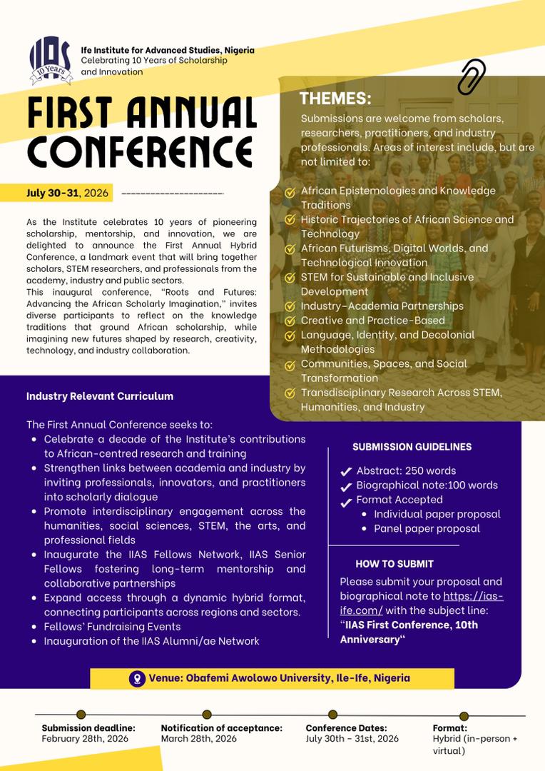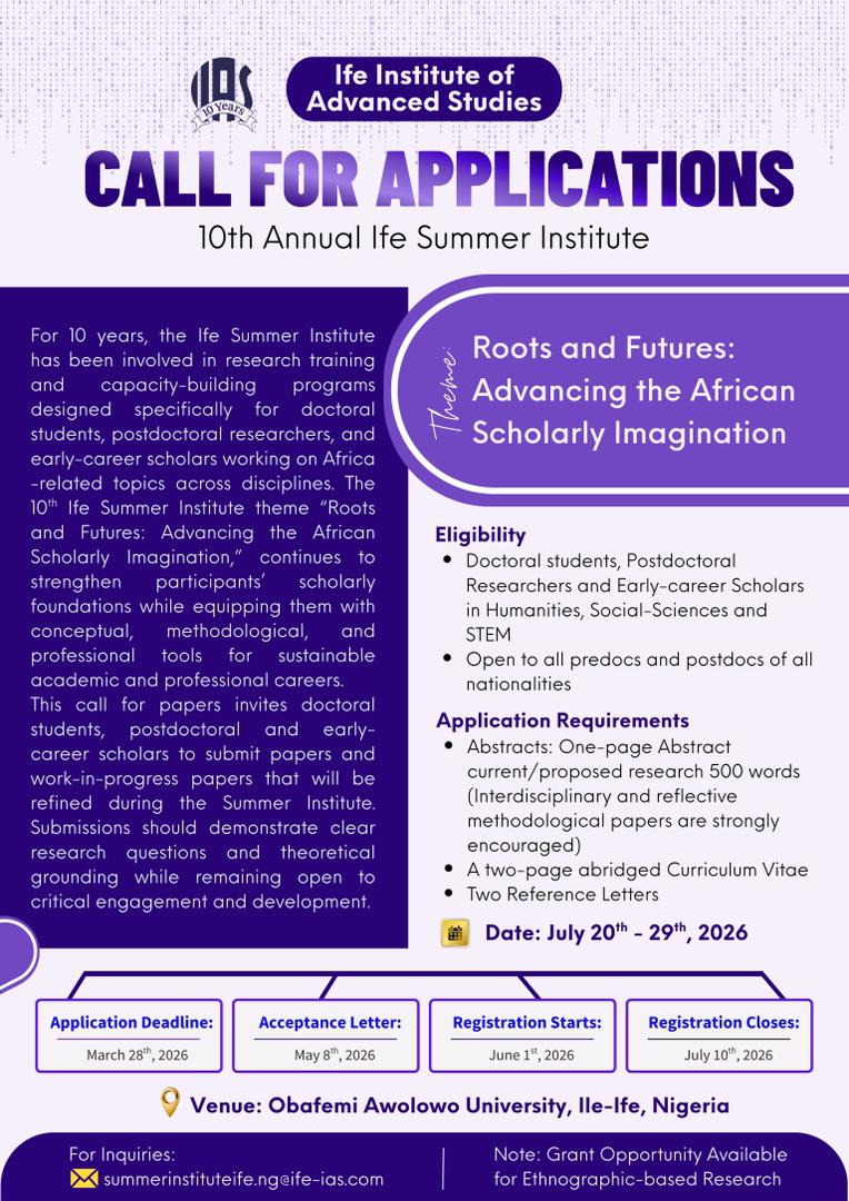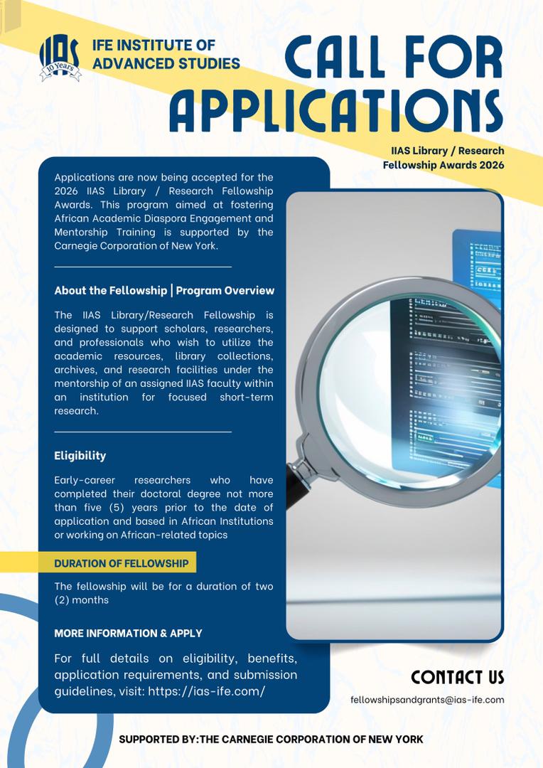 Ife Institute of Advanced Studies, Nigeria invites applications for a Library/Research Fellowship for three successful candidates for a duration of two (2) months...