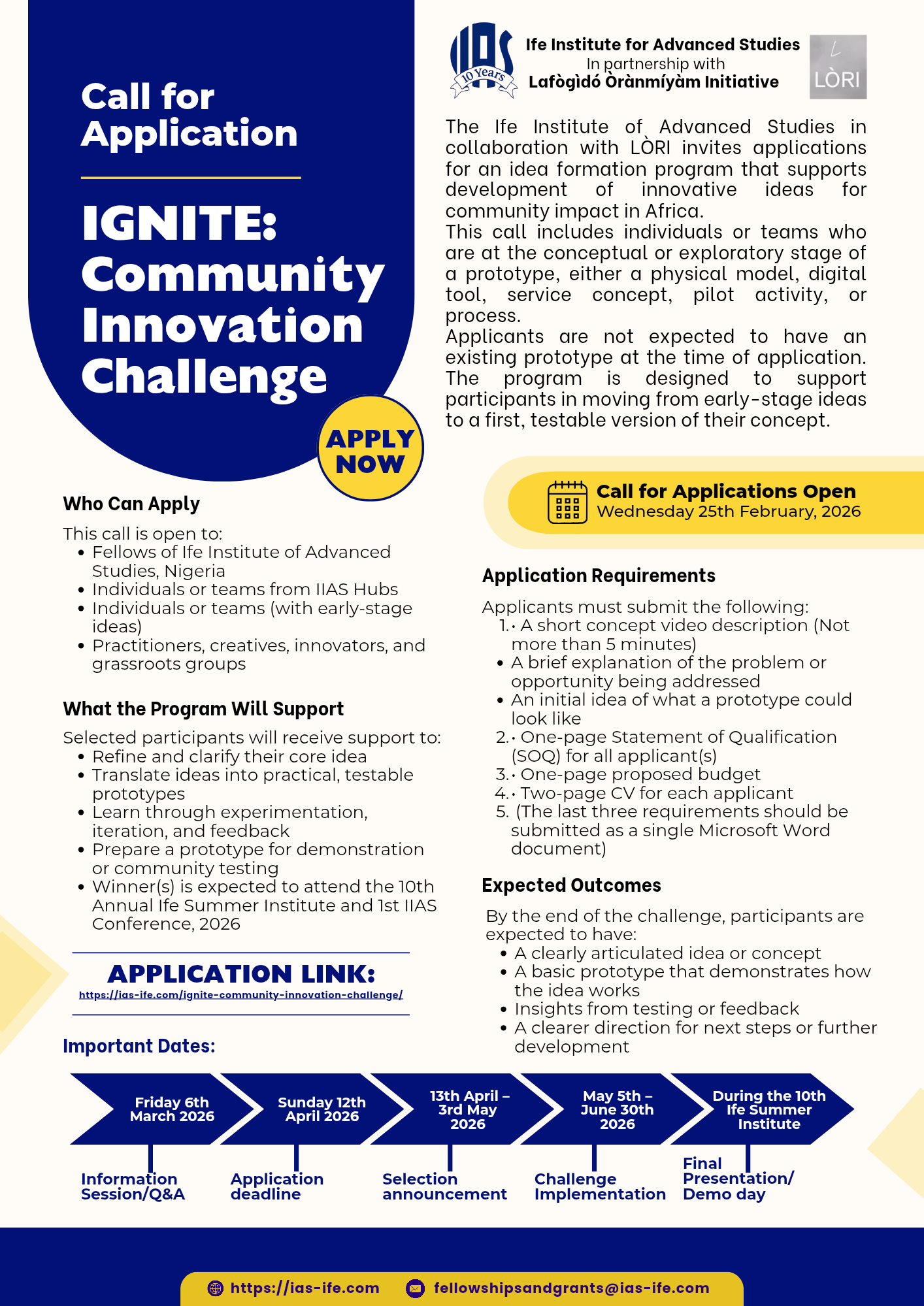 The Ife Institute of Advanced Studies, in collaboration with LÒRI, invites applications for an idea formation program that supports development of innovative ideas for community impact in Africa...